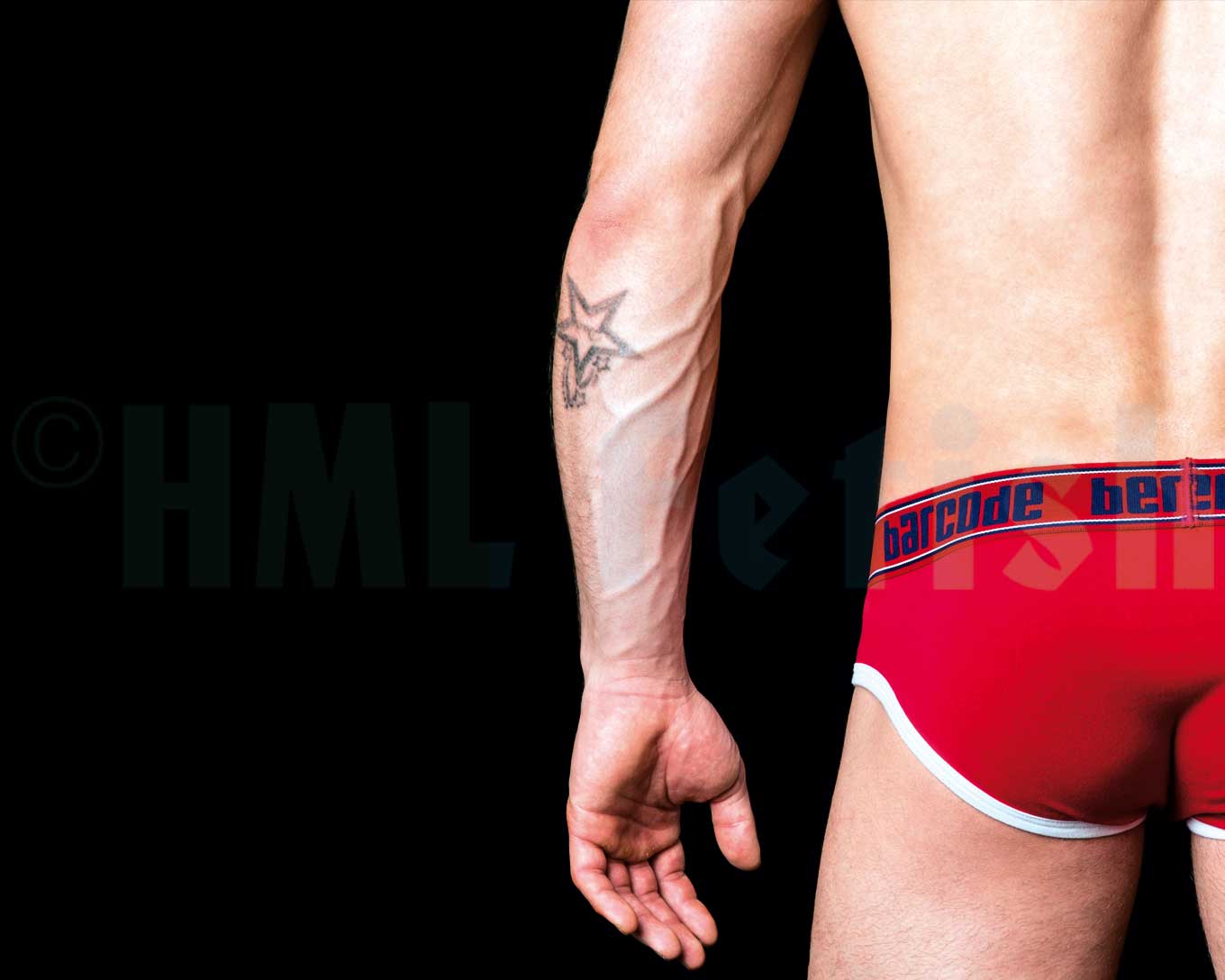 Dieser rote Slip mit weißer Einfassung besitzt einen kontrastfarbigen blauen Beutel mit besonders viel Platz und am Arsch kräftig gefärbte Baumwolle. Super sexy und sehr pflegeleicht! Materialmix: 95% Baumwolle, 5% Elasthan. Größen S, M und L.