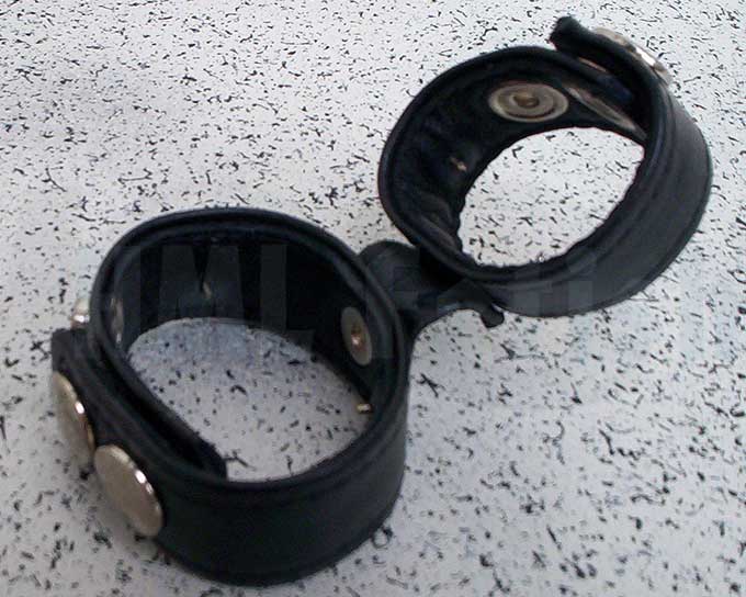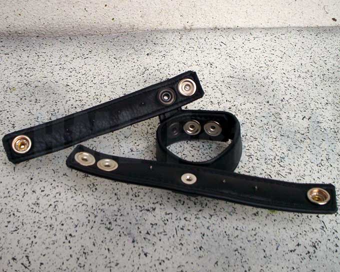 Zwei Lederbänder, fest miteinander verbunden. Jedes etwa 2 cm breit. Nicht aus Gürtelleder geschnittene Streifen, sondern aus zwei Lagen Bekleidungsleder gefertigt, darum besonders haltbar, feuchtigkeitsunempfindlich und mit einem soften Tragegefühl ohne scharfe Kanten. Einstellbar mit großen Druckknöpfen: Das größere Band auf 45 mm, 50 mm oder 55 mm Durchmesser und das kleinere auf 35 mm oder 40 mm. Beide Bänder sind innen mit spitzen Dornen besetzt!