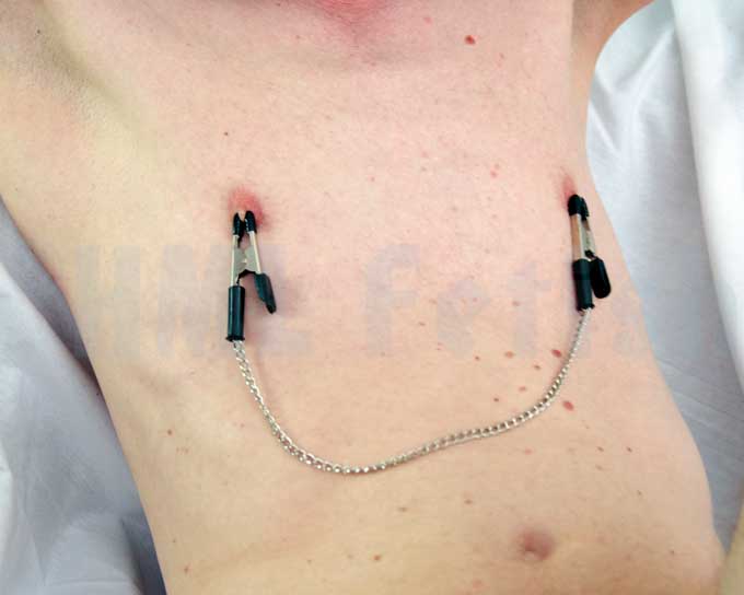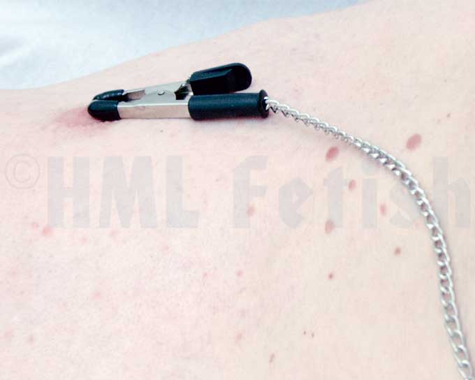 This is the classic alligator clamp used elsewhere to pick up voltage from electric cables. With small teeth under the black protective caps. One pair connected with a chain. These middle-hard clampd are good-valued gear for beginners. Test it. And if you can stand them, this may be your access to the fascinating world of SM play.