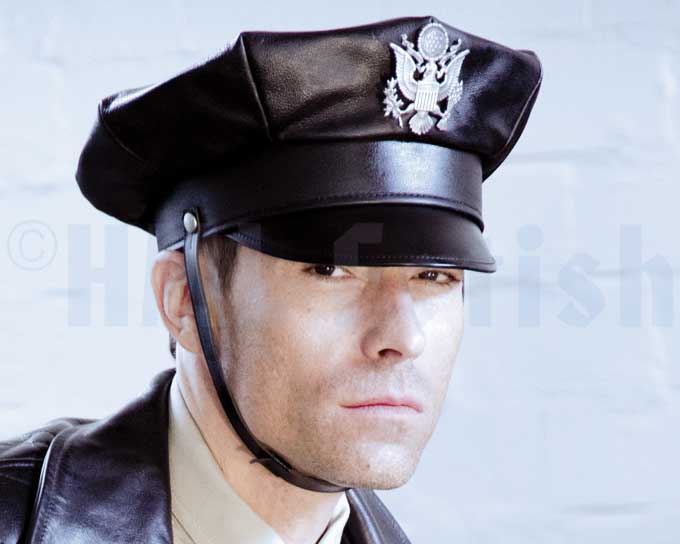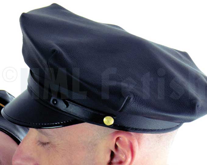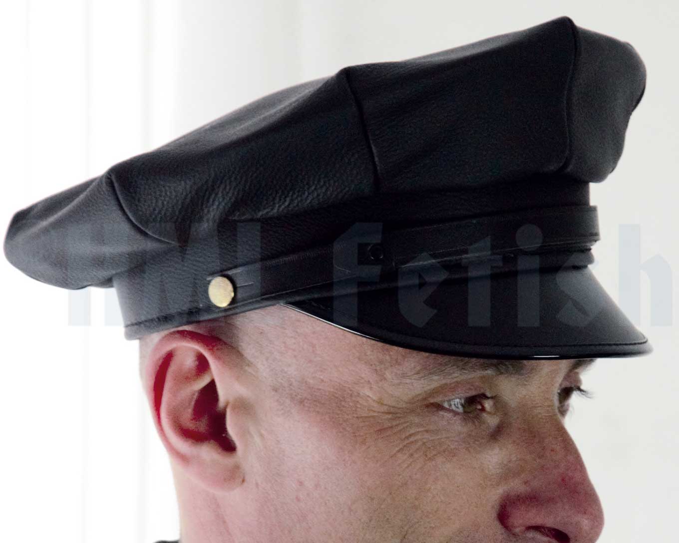 Black, shiny soft leather, sumptuous worked up with plastic visor, sealing strip and satin lining. Even the chin strap is made of leather. Available in the German hat sizes from 55 up to 62. E.g. Size 57 means 57 cm forehead circumference). This muir cap is sold exclusively by us. Comes here as an 8-point cushionaire, like worn by cops in San Francisco and New York (SFPD and NYPD).