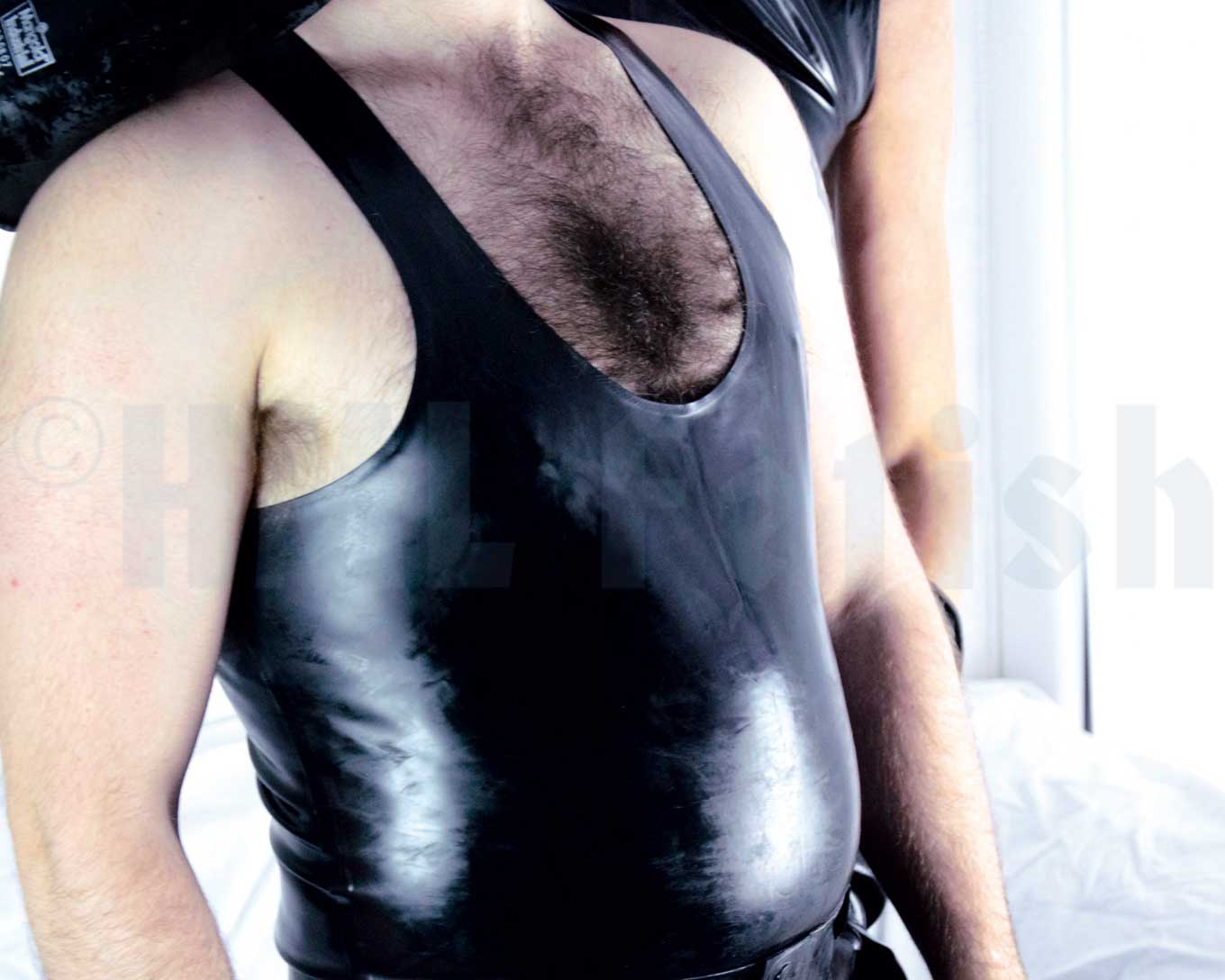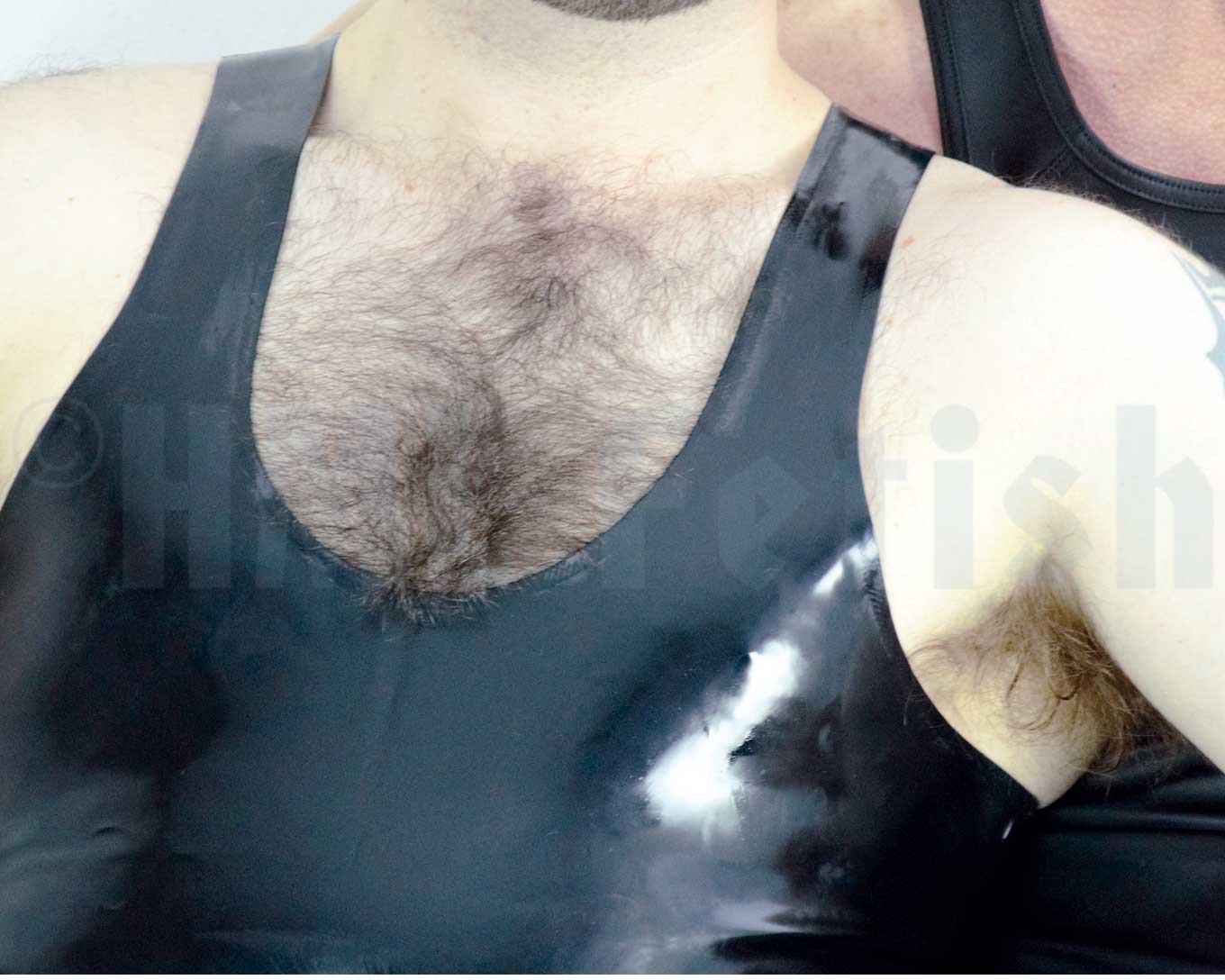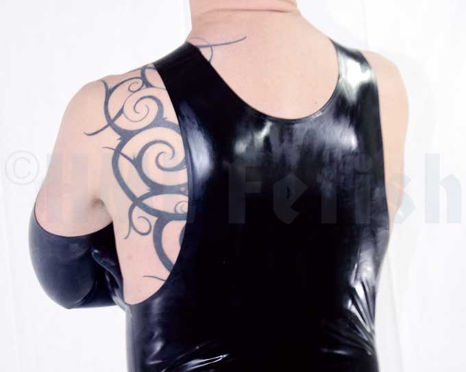 Ein Tank-Top aus schwarzem Latex mit 0,35 mm Stärke. In den Größen S, M, L, XL und XXL (+ 10 €). Den geilen Glanz erzeugst du übrigens mit einem unserer Gummi Pflegemittel.